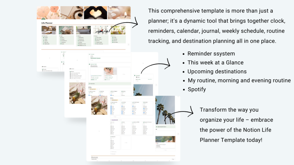 Welcome to the epitome of organization and productivity! Elevate your planning experience with our Notion Life Planner – a meticulously crafted template designed for seamless integration into your Notion workspace. Dive into a world of efficiency with our all-in-one Notion Planner, featuring a stunning aesthetic, intuitive calendar templates, and a dynamic dashboard. Transform your daily routine into a masterpiece of productivity today! ✨🌈